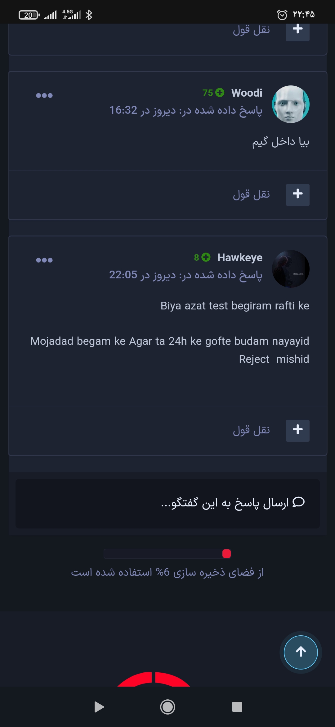 Woodi ارسال شده در 7 ساعت قبل اشتراک گذاری ارسال شده در 7 ساعت قبل عکس سایز کوچک شما از "اطلاعات کاربری" از طریق کنترل پنل: • عکس سایز کوچک کسی که از او شکایت دارید از "اطلاعات کاربری" از طریق کنترل پنل: • عکس سایز کوچک از "اطلاعات کاربری" از شاهدین از طریق کنترل پنل: ------- • توضیحات: با سلام و درود خدمت شما دوست گرامی ایشون سال لیدر است و به بنده 24 ساعت وقت داده بود و به من زنگ زده بود من روب بانک بودم و wa داشتم و من بی دلیل رد کرد لطفاً رسیدگی کنید 24 ساعتم نه شده بود • مدارک (فیلم یا عکس): 1 نقل قول لینک به دیدگاه https://forum.arsacia.ir/topic/87919-%D8%AA%D8%B3%D8%AA-%D9%86%D9%87-%DA%AF%D8%B1%D9%81%D8%AA%D9%86-%D9%88-%D8%B1%D8%AF-%DA%A9%D8%B1%D8%AF%D9%86-%D8%A8%DB%8C-%D8%AF%D9%84%DB%8C%D9%84-heydar/ به اشتراک گذاری در سایت های دیگر تنظیمات بیشتر اشتراک گذاری...