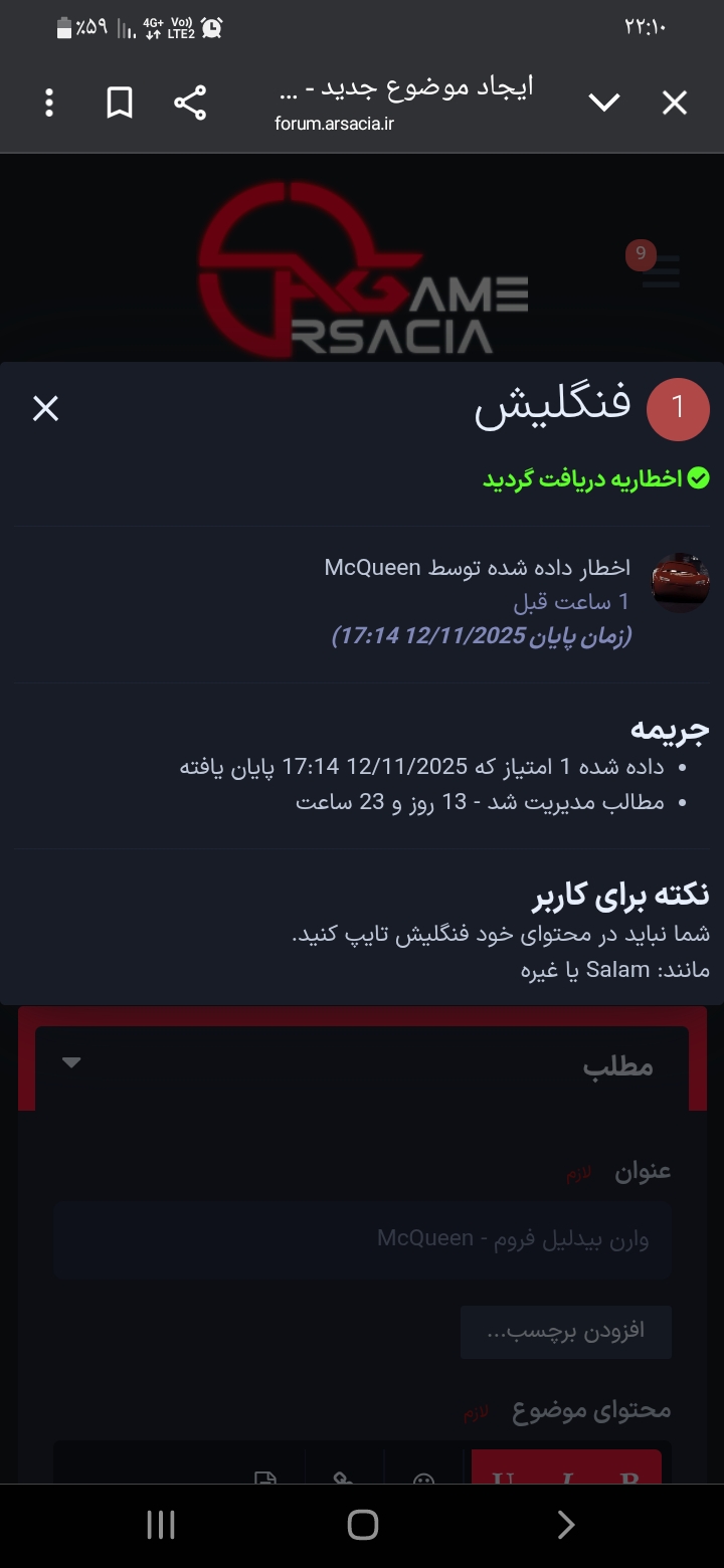 MohammadTaha ارسال شده در سهشنبه در 18:41 اشتراک گذاری ارسال شده در سهشنبه در 18:41 (ویرایش شده) • عکس سایز کوچک شما از "اطلاعات کاربری" از طریق کنترل پنل: • عکس سایز کوچک کسی که از او شکایت دارید از "اطلاعات کاربری" از طریق کنترل پنل: • عکس سایز کوچک از "اطلاعات کاربری" از شاهدین از طریق کنترل پنل:- • توضیحات:ایشون بیدلیل به بنده وارن فروم داده اند. • مدارک (فیلم یا عکس): https://uploadkon.ir/uploads/257811_25Screenshot-۲۰۲۵۱۱۱۱-۲۲۱۰۴۱-Chrome.jpg ویرایش شده سهشنبه در 18:42 توسط MohammadTaha Angel Of Darkness [999] لینک به دیدگاه https://forum.arsacia.ir/topic/91492-%D9%88%D8%A7%D8%B1%D9%86-%D8%A8%DB%8C%D8%AF%D9%84%DB%8C%D9%84-%D9%81%D8%B1%D9%88%D9%85-mcqueen/ به اشتراک گذاری در سایت های دیگر تنظیمات بیشتر اشتراک گذاری...