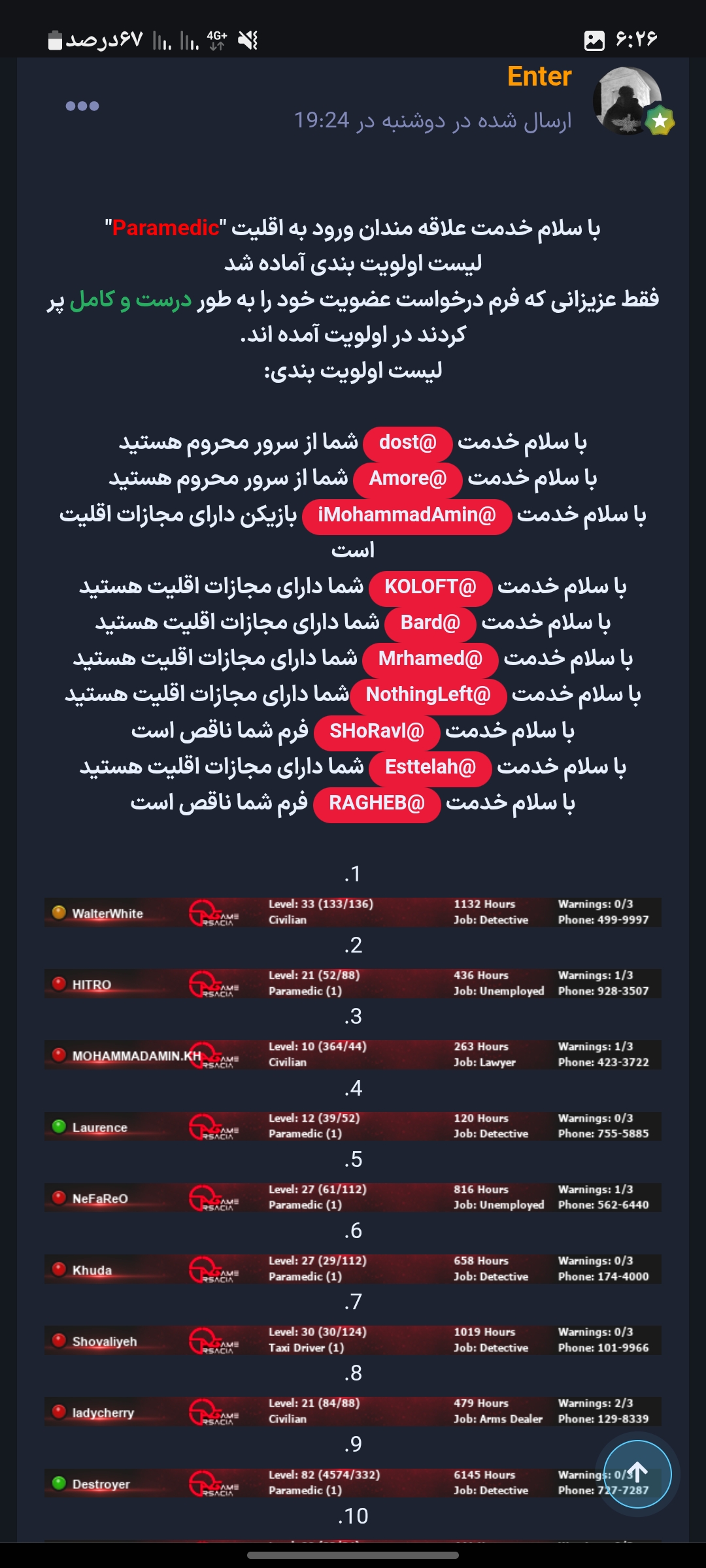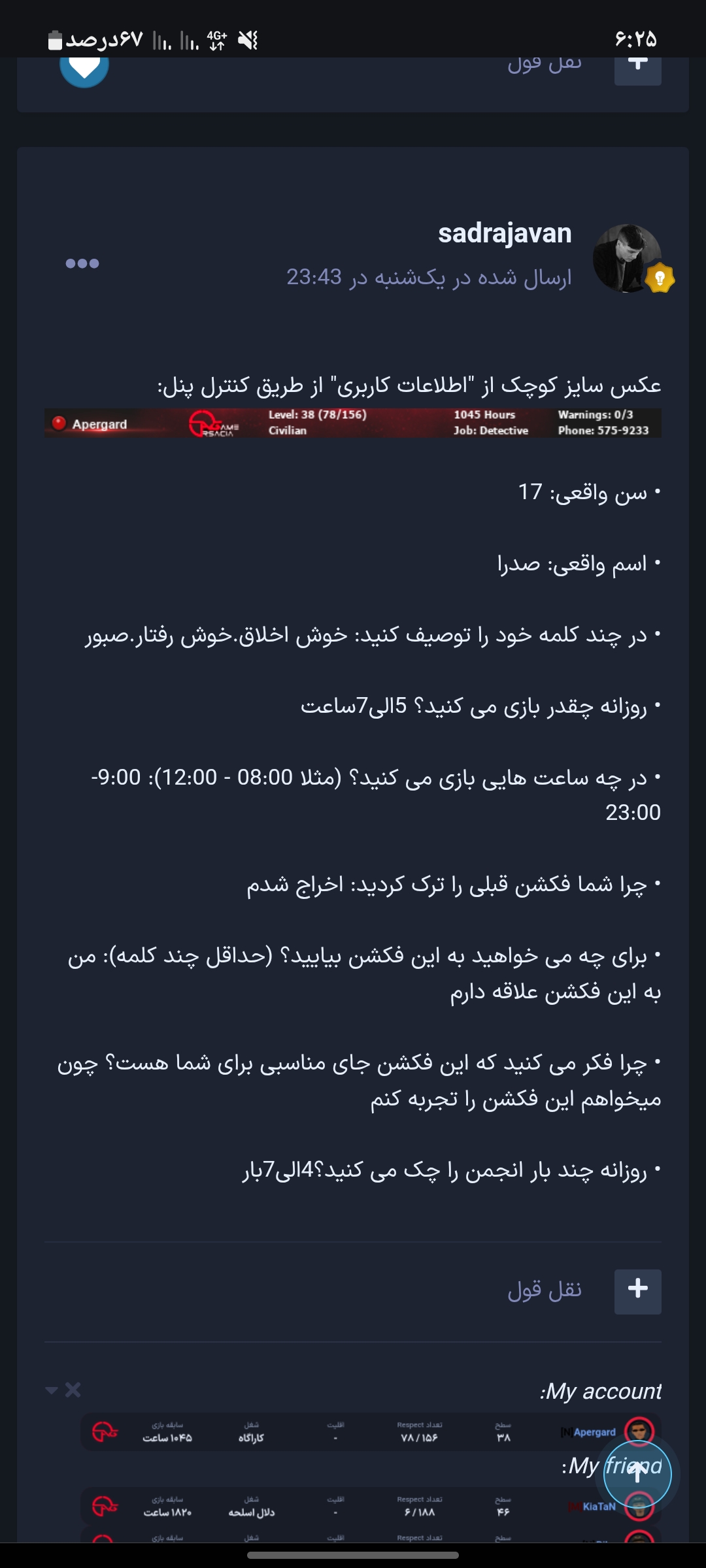 sadrajavan ارسال شده در 16 ساعت قبل اشتراک گذاری ارسال شده در 16 ساعت قبل • عکس سایز کوچک شما از "اطلاعات کاربری" از طریق کنترل پنل: • عکس سایز کوچک کسی که از او شکایت دارید از "اطلاعات کاربری" از طریق کنترل پنل: • عکس سایز کوچک از "اطلاعات کاربری" از شاهدین از طریق کنترل پنل: خدا • توضیحات: بنده در اولویت بندی امدادگر شرکت کردم و در لیست اولویت بندی من رو قرار ندادند و چند باری هم به لیدر محترم پیام ارسال کردم ولی به پیام من بازخوردی ارسال نکردند. • مدارک (فیلم یا عکس) : My account: My friend: لینک به دیدگاه https://forum.arsacia.ir/topic/94448-%D8%B9%D8%AF%D9%85-%D9%82%D8%B1%D8%A7%D8%B1-%D8%AF%D8%A7%D8%AF%D9%86-%D8%AF%D8%B1-%D8%A7%D9%88%D9%84%D9%88%DB%8C%D8%AA-%D8%A8%D9%86%D8%AF%DB%8C-hirad/ به اشتراک گذاری در سایت های دیگر تنظیمات بیشتر اشتراک گذاری...