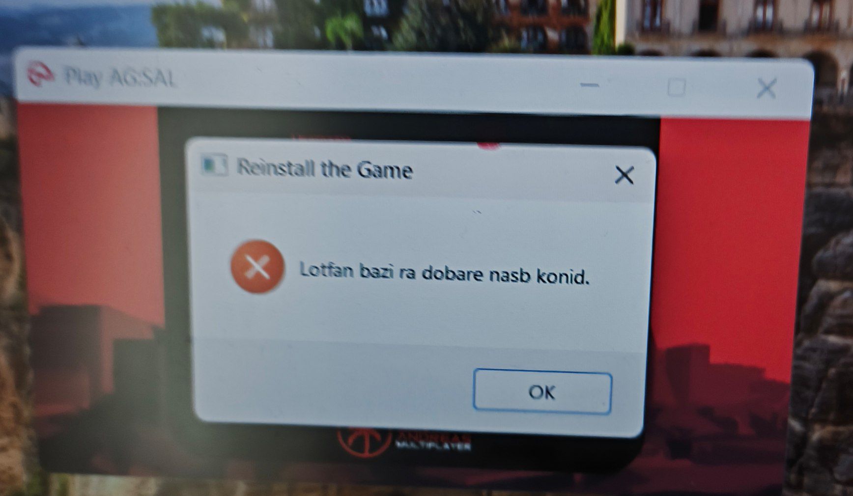 Toge ارسال شده در دوشنبه در 07:50 اشتراک گذاری ارسال شده در دوشنبه در 07:50 سلام وقت بخیر. من هنگام اجرای لانچر ArSaCiA با ارور زیر روبهرو میشوم: "بازی را دوباره نصب کنید" و مسیر نصب فعلی بازی: C:\Program Files (x86)\ArSaCiA Game\San Andreas لطفاً راهنمایی کنید که مشکل از کجاست ممنون میشم راهنمایی کنید با سمپ لانچر هم امتحان کردم و با این ارور روبرو شدم 14 دقیقه قبل، Toge گفته است: سلام وقت بخیر. من هنگام اجرای لانچر ArSaCiA با ارور زیر روبهرو میشوم: "بازی را دوباره نصب کنید" و مسیر نصب فعلی بازی: C:\Program Files (x86)\ArSaCiA Game\San Andreas لطفاً راهنمایی کنید که مشکل از کجاست ممنون میشم راهنمایی کنید با سمپ لانچر هم امتحان کردم و با این ارور روبرو شدم دوستان لطفاً سریع کمک کنید نقل قول لینک به دیدگاه https://forum.arsacia.ir/topic/94851-lotfan-baz%C4%B1-ra-dobare-nasb-konid-%D8%A7%D8%B1%D9%88%D8%B1/ به اشتراک گذاری در سایت های دیگر تنظیمات بیشتر اشتراک گذاری...