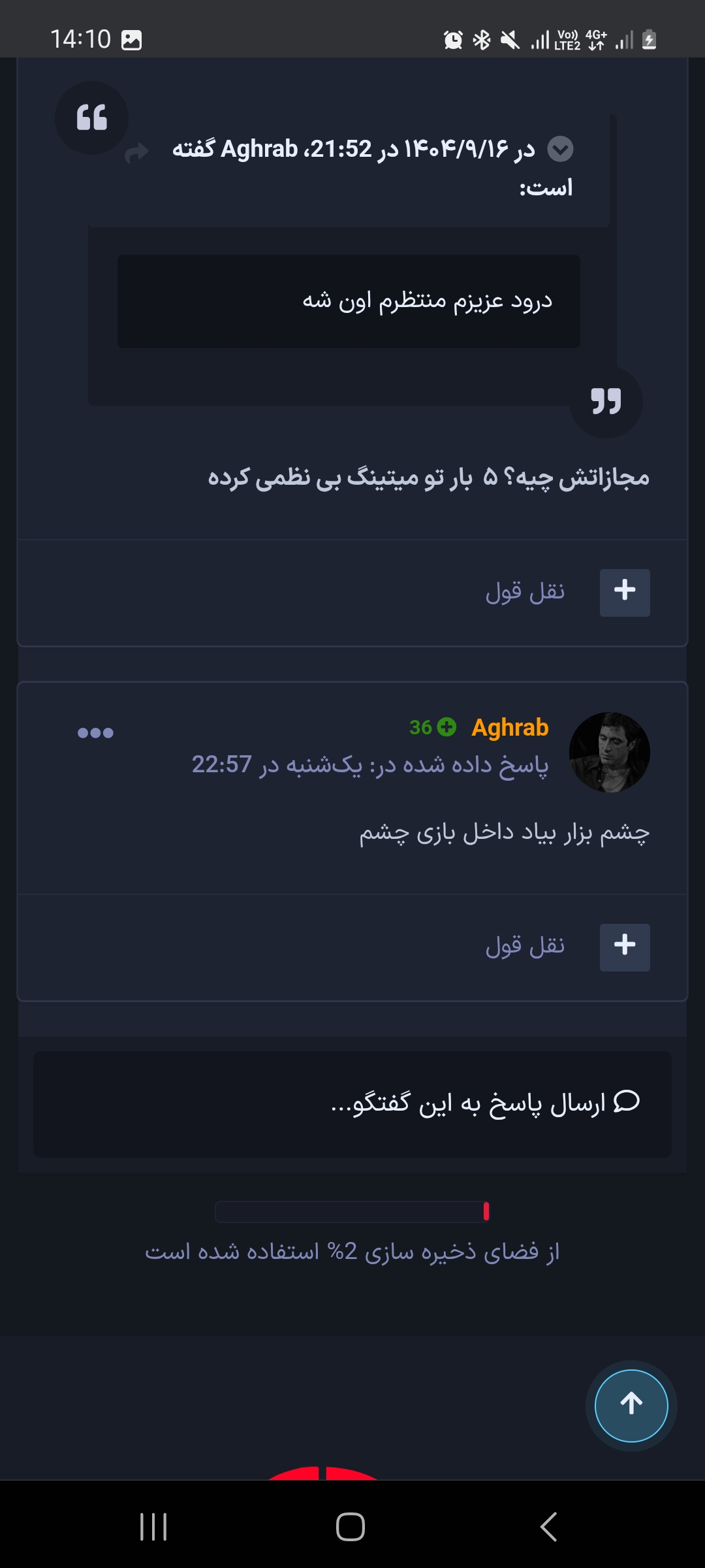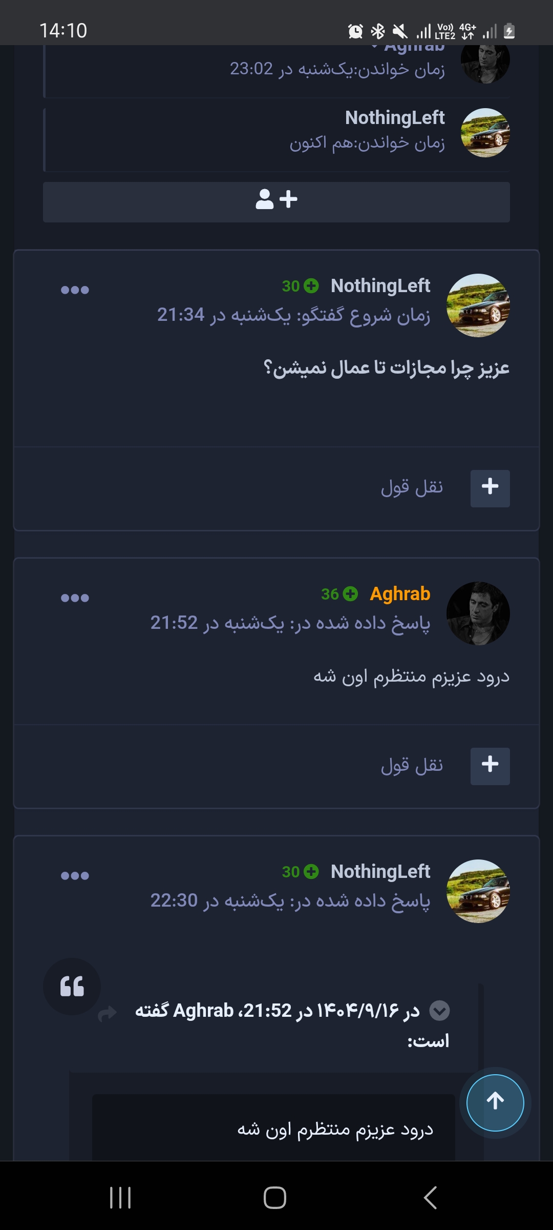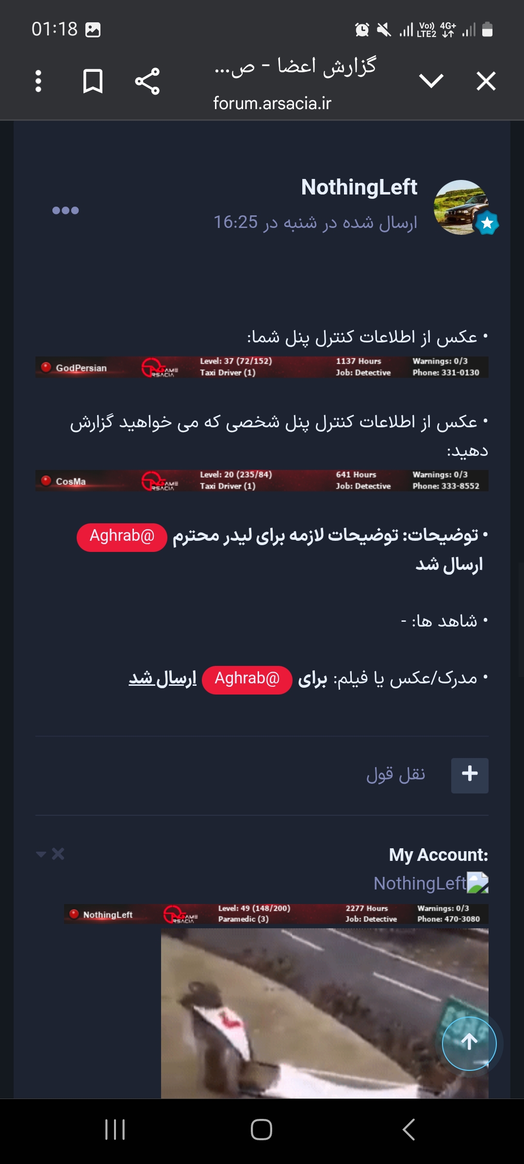 NothingLeft ارسال شده در 20 ساعت قبل اشتراک گذاری ارسال شده در 20 ساعت قبل (ویرایش شده) • عکس سایز کوچک شما از "اطلاعات کاربری" از طریق کنترل پنل: • عکس سایز کوچک کسی که از او شکایت دارید از "اطلاعات کاربری" از طریق کنترل پنل: • عکس سایز کوچک از "اطلاعات کاربری" از شاهدین از طریق کنترل پنل: - • توضیحات: مجازات نکردن به موقه خریدن وقت برای گرفتن رنک دو (بنده درخواست مجازات شدن لیدر مربوطه را ندارم فقد پلیر مربوطه مجازات بشن قبل از میتینگ جمعه) اقای Escort بار ها گفتند بعد انلاین شدنفرد مجازات عمال میشود ولی 3 روز گذشته و مجازاتی عمال نشده بازمتکرار میکنم که لیدر مربوطه مجازات نشود... و اینکه ایشون بهونه اوردن تا ان نشن نمیشه مجازات کرد ولی در صورت افلاین بودن میتوان مجازت هارو عمال کرد پلیر مربوطه در میتینگ بیش از 5 بار چت بی دلیل داده اطلاعات کاربری کسی که شکایت شده در اعضای تاکسی: و مدارک خدمت لیدر محترم ارسال شد و ایشون تایید کردن و نادیده گرفتن شکایت بنده رو • مدارک (فیلم یا عکس): مدارک بی اهمیتی به شکایت مدرکدوم مدرک سوم مدرک طول دادن مجازات مدرکدوم ویرایش شده 20 ساعت قبل توسط NothingLeft :My Account :My Bro لینک به دیدگاه https://forum.arsacia.ir/topic/95008-%D9%85%D8%AC%D8%A7%D8%B2%D8%A7%D8%AA-%D9%86%DA%A9%D8%B1%D8%AF%D9%86-escort/ به اشتراک گذاری در سایت های دیگر تنظیمات بیشتر اشتراک گذاری...