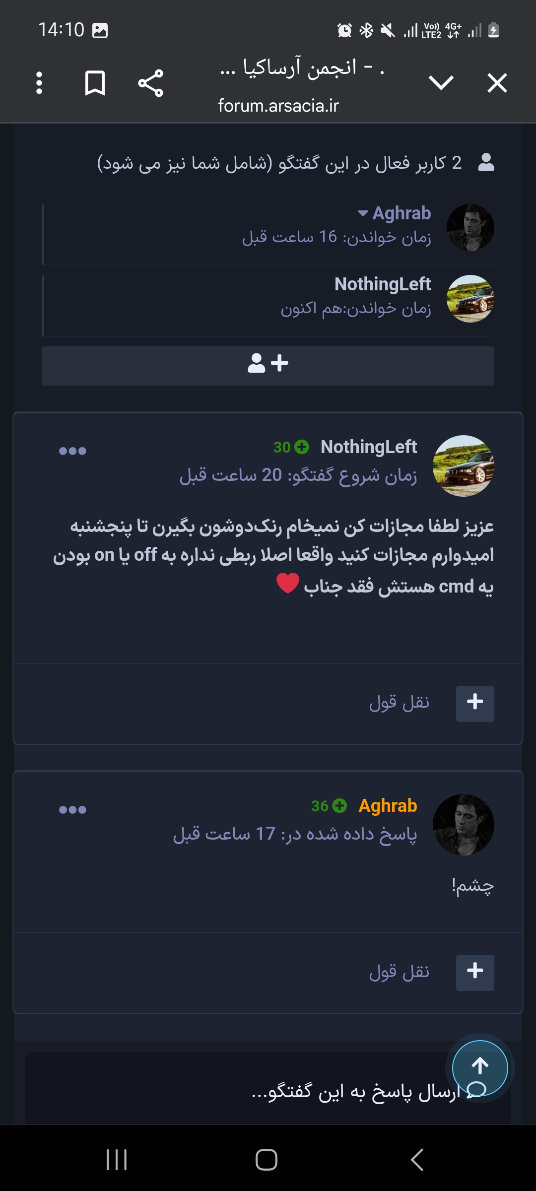 NothingLeft ارسال شده در 14 ساعت قبل سازنده اشتراک گذاری ارسال شده در 14 ساعت قبل 2 ساعت قبل، Aghrab گفته است: درود. دوست عزیز وقتی این شخص نمیاد داخل بازی که بنده مجازات شو روش عمال کنم بنظرت بنده چی کار کنم؟ بنده داخل بازی ام به شما گفتم جمعه که آمد سر متینگ عمال میکنم! Staff-Note درود بر شما بنده هم گفتم شما مجازات نمیخام بشین فقد قبل میتینگ جناب cosma مجازت کنید تا رنکدو نشن :My Account :My Bro لینک به دیدگاه https://forum.arsacia.ir/topic/95008-%D9%85%D8%AC%D8%A7%D8%B2%D8%A7%D8%AA-%D9%86%DA%A9%D8%B1%D8%AF%D9%86-escort/#findComment-975799 به اشتراک گذاری در سایت های دیگر تنظیمات بیشتر اشتراک گذاری...