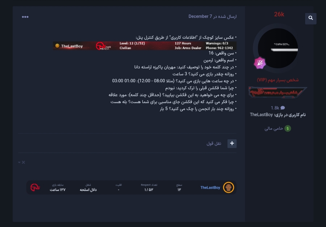 DrDep ارسال شده در 16 ساعت قبل اشتراک گذاری ارسال شده در 16 ساعت قبل با سلام و درود خدمت شما دوست عزیز در بخش اینکه چرا میخواهید به این فکشن بیاید و چند کلمه بنویسید باید ۳ مورد باشه ولی شما ۲ مورد نوشتید عملکرد لیدر مربوطه درست بوده موفق باشید بسته شد در تاریخ بنویسید مارو در اذان صبح اعدام می کنند در اذان شب به گلوله می بندند کسانی که خدایشان رحمان پیامبرشان مهربان و امامشان مظلوم بوده لینک به دیدگاه https://forum.arsacia.ir/topic/95501-%D8%B1%D8%AF-%DA%A9%D8%B1%D8%AF%D9%86-%D9%BE%D8%B3%D8%AA-%D8%AF%D8%B1%D8%AE%D9%88%D8%A7%D8%B3%D8%AA-%D8%A8%DB%8C-%D8%AF%D9%84%DB%8C%D9%84-sadaf/#findComment-979208 به اشتراک گذاری در سایت های دیگر تنظیمات بیشتر اشتراک گذاری...